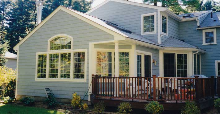 A basic colonial house added a family room off a renewed kitchen with big deck off the back.